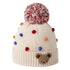 This cozy knit hat features an adorable teddy bear motif, accented with playful knit dots and a soft pom-pom on top.