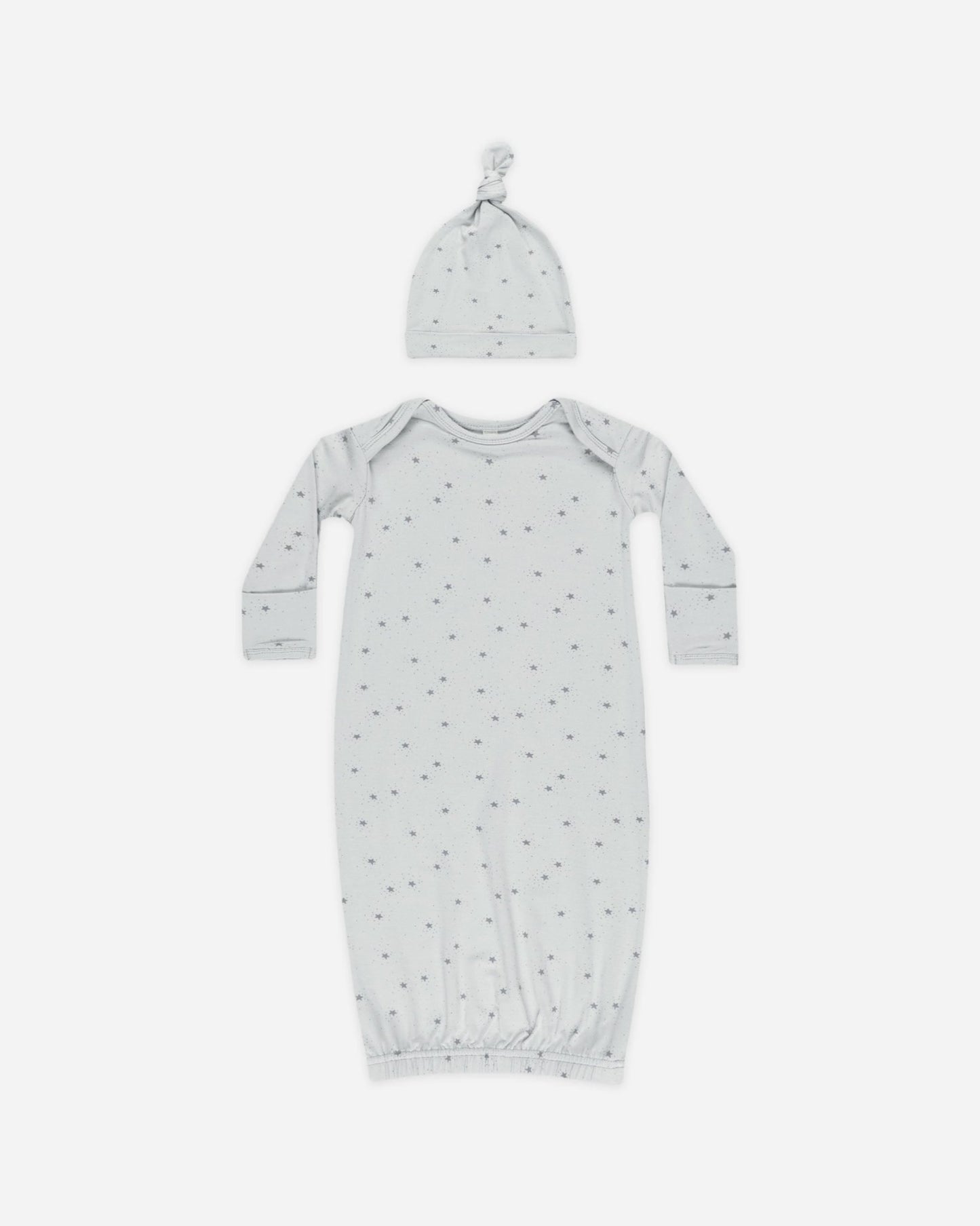 Baby gown with elastic bottom opening and fold over hand mitts in our signature soft and stretchy bamboo fabric. Includes a coordinating knotted hat for cozy comfort.