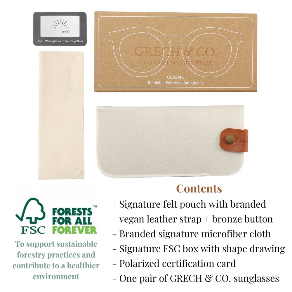 Crafted from energy-efficient TPEE material, the GRECH & CO. bendable sunglasses are lightweight and feature durable UV 400 - Category 3 protection -TAC lenses, making our sunglasses perfect for daily wear.