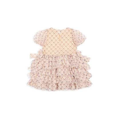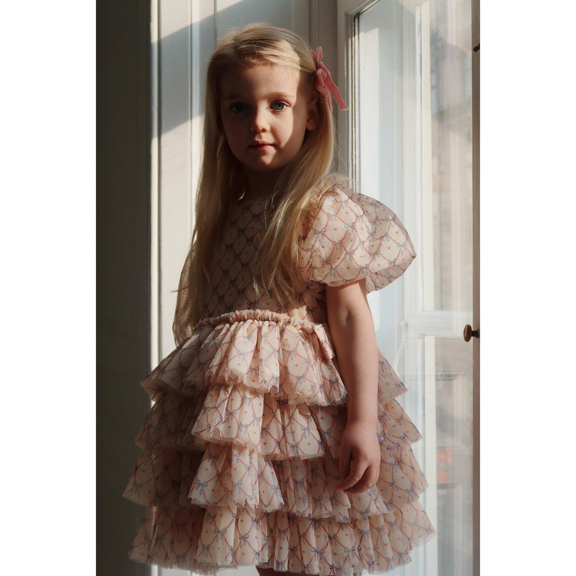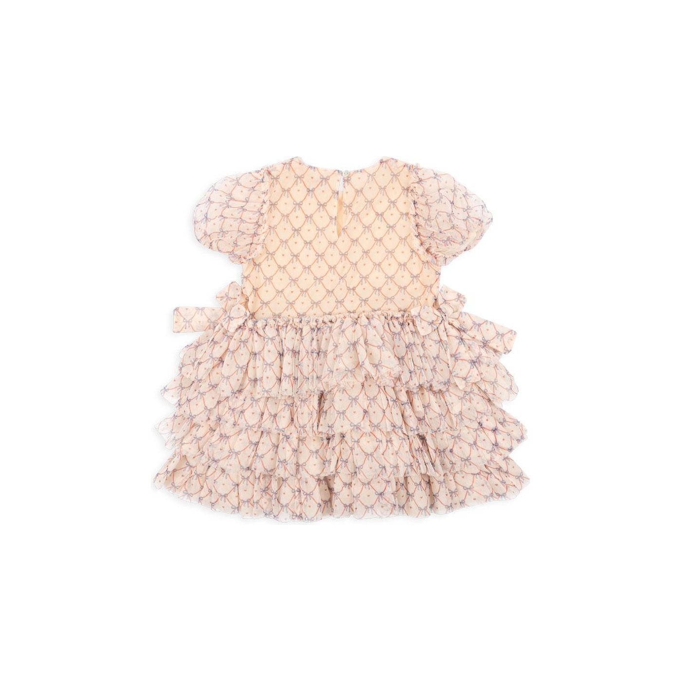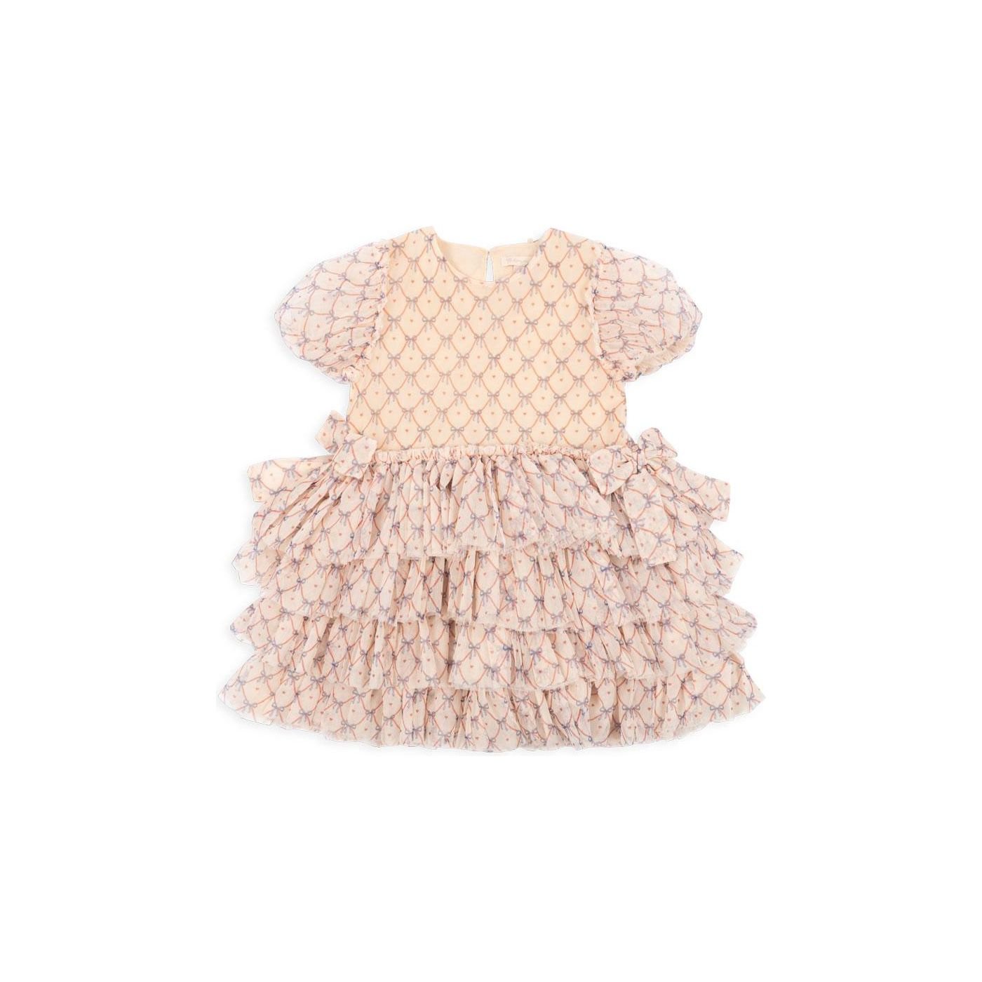 Festive dress with elegant and intricate detailing. Designed with puffy sleeves and a full, layered skirt. Made from 100% recycled polyester with a 100% organic cotton lining This product contains 100% GRS-certified polyester