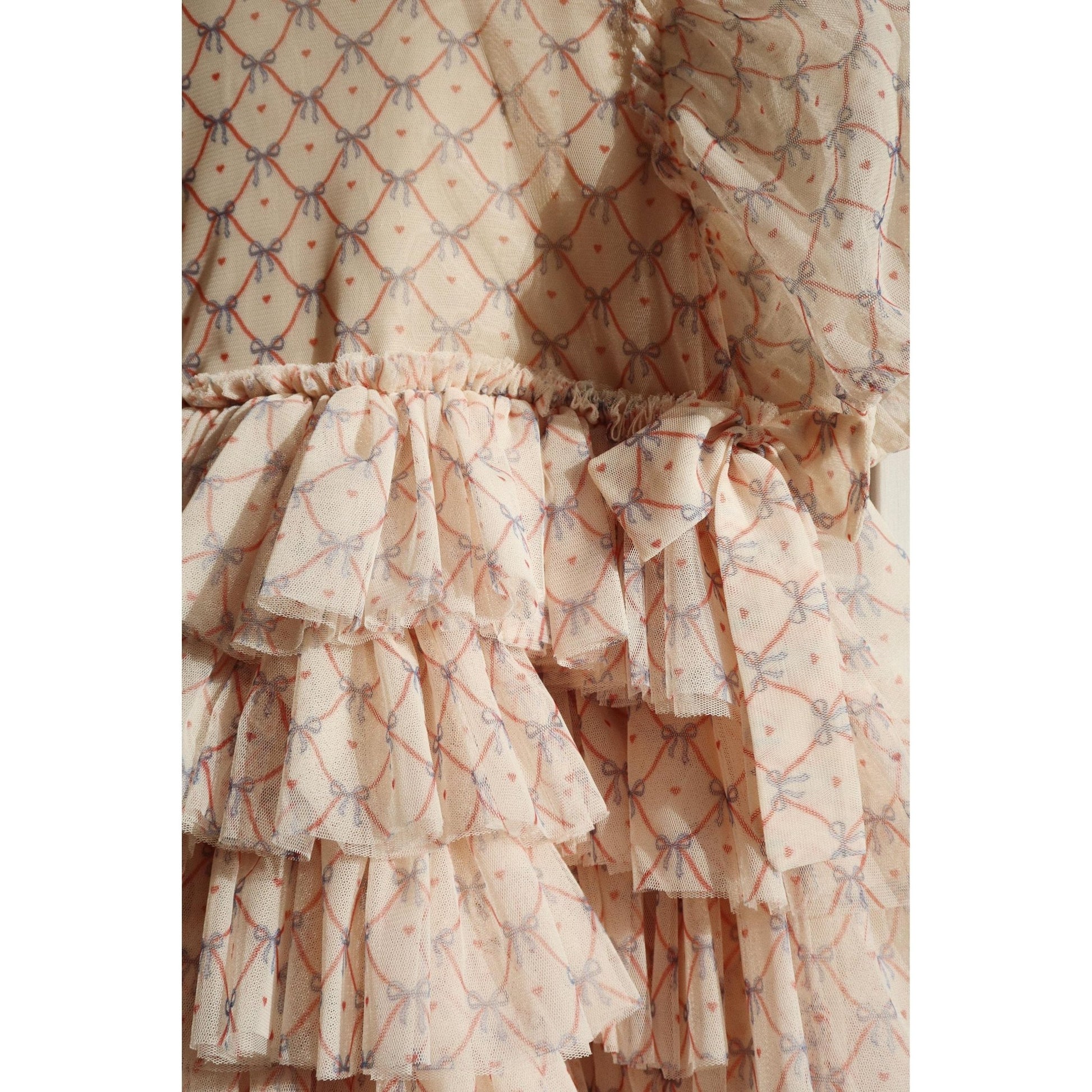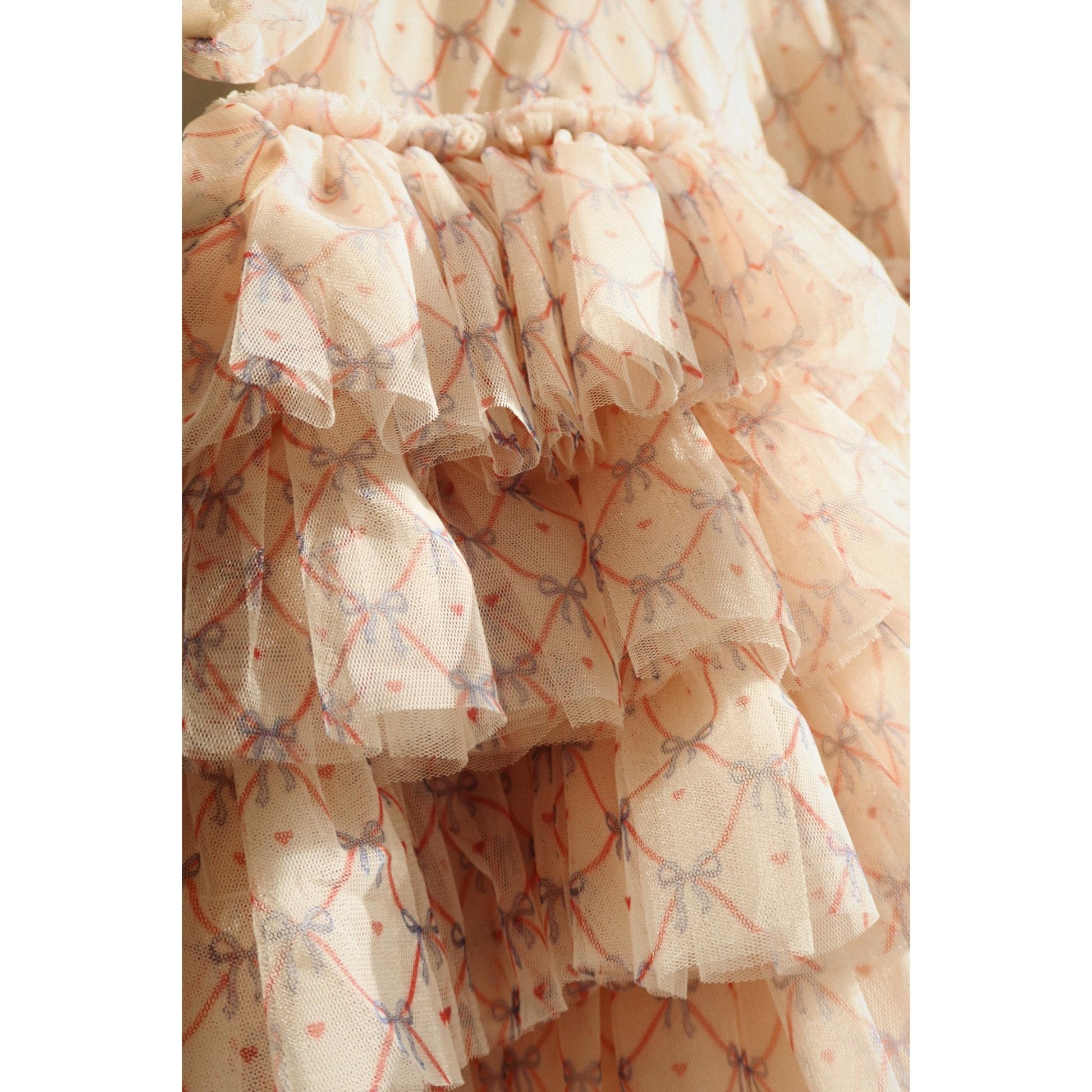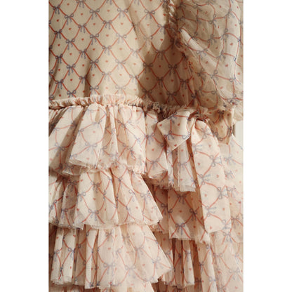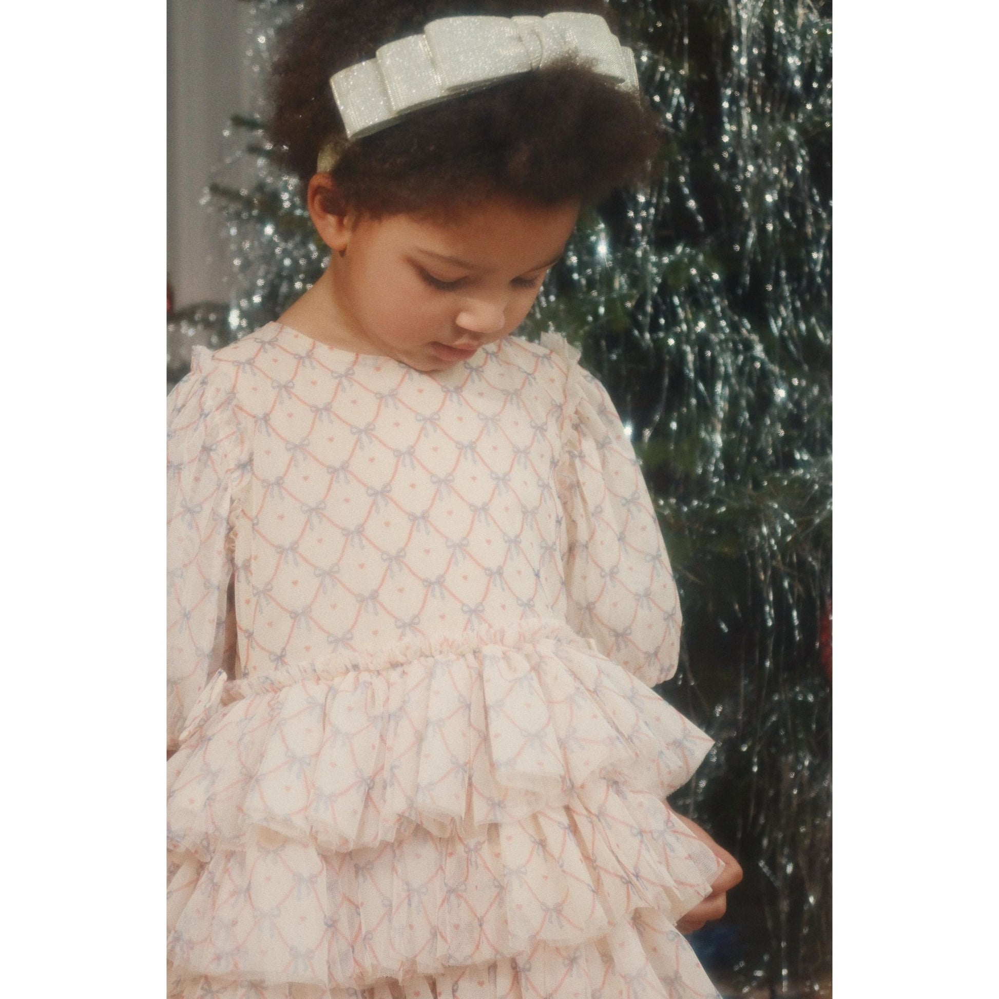 Festive dress with elegant and intricate detailing. Designed with puffy sleeves and a full, layered skirt. Made from 100% recycled polyester with a 100% organic cotton lining This product contains 100% GRS-certified polyester