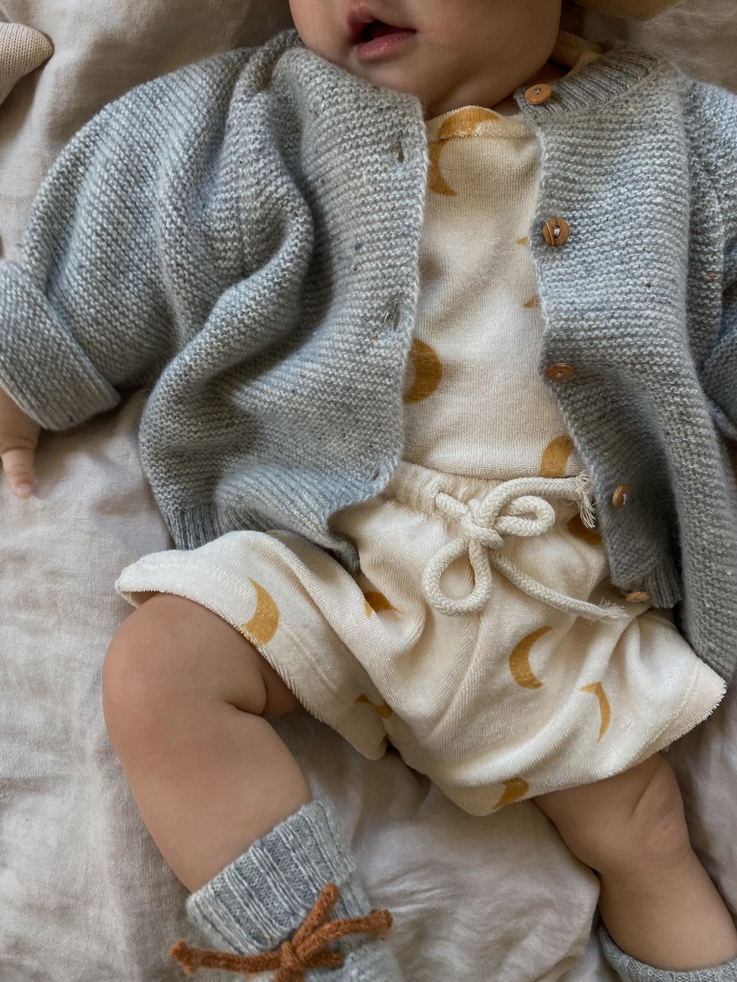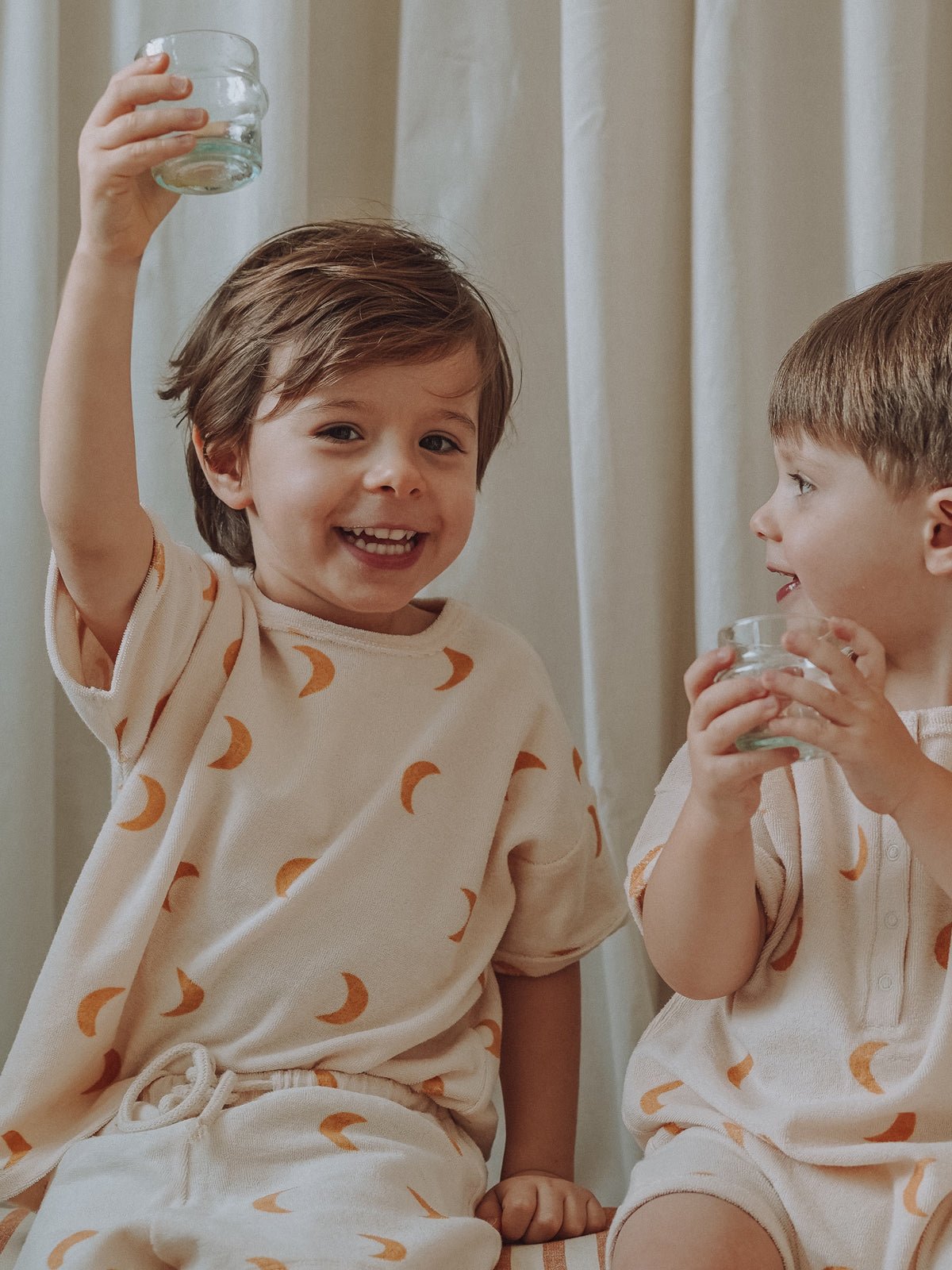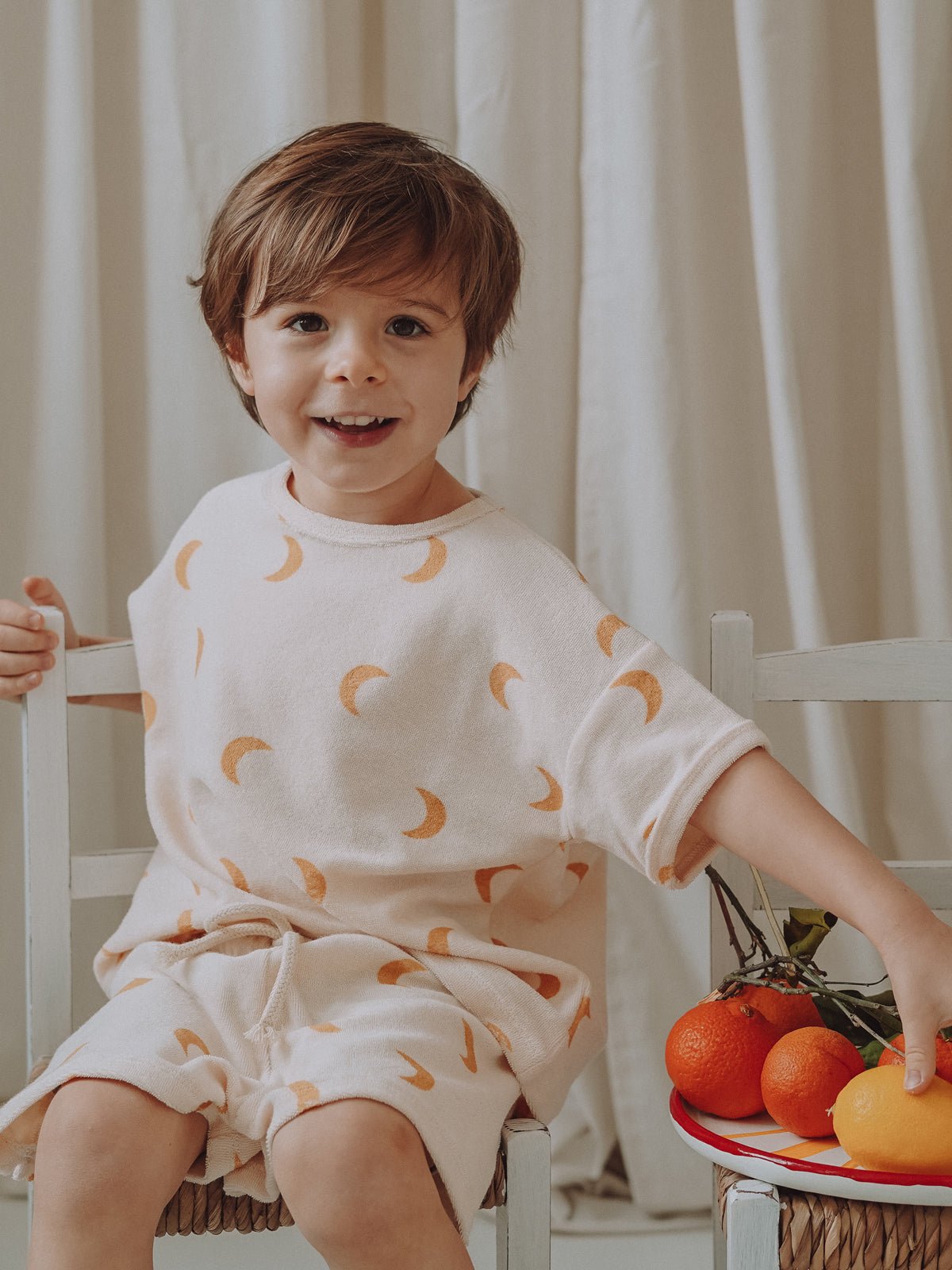 This season's midnight print features moons in a beautiful honey hue - ideal for all these long days at the beach and play dates in the park. Pair it with the matching shorts or bottoms from our new summer range.