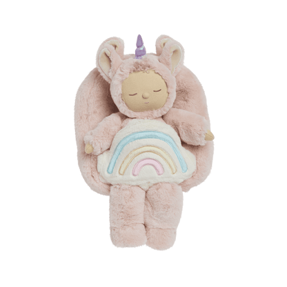 The plush rainbow pocket on the front is just the right size for a little friend to tag along (Our Unicorn Dinkys love to hang out here) , complete with elastic loops and leg holes to keep them snug on the go. When it's time to tuck the doll away, simply close the bottom with the handy plastic poppers. Inside the rainbow pocket, you’ll find a tiny secret space, perfect for stashing little treasures.