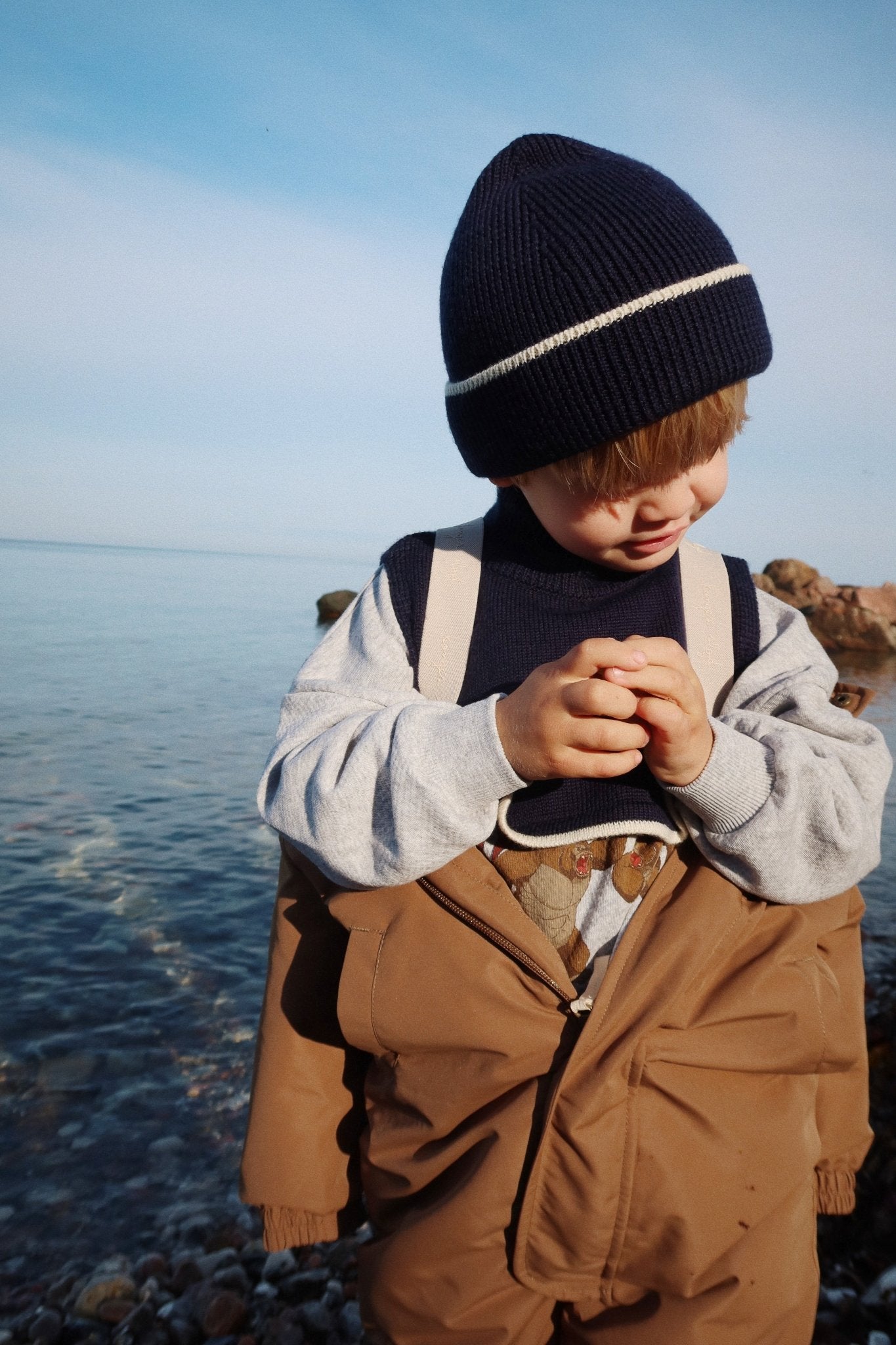 Knitted beanie in a breathable and warm wool quality. Finished in a firm yet flexible rib structure for a comfortable fit