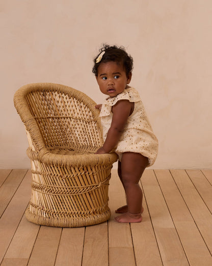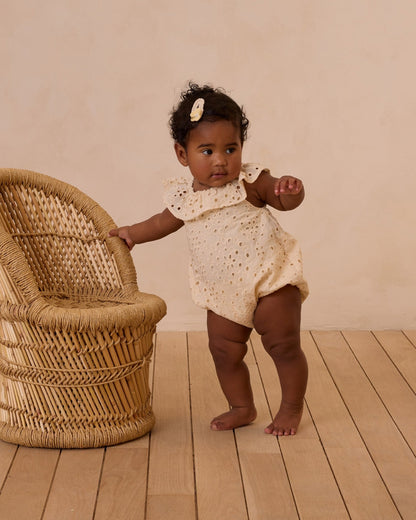 This beautiful eyelet romper is a sure summer staple for your little ones. With a sweet ruffle collar and bottom snaps for easy wear.