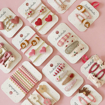 Flutter by like a folksy butterfly! This pack of four ponies include two folksy butterflies on spotty elastics and two red velvet hearts on gold elastics.