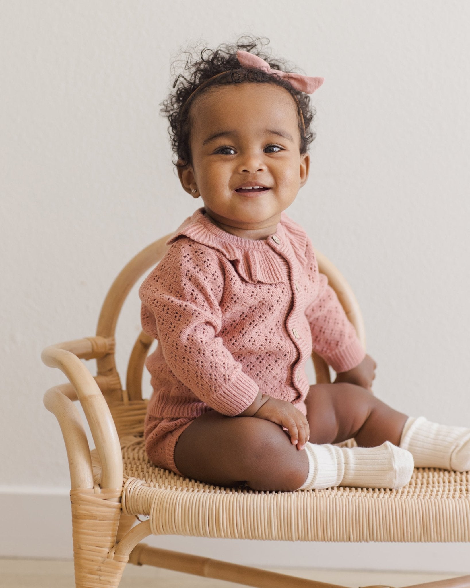 This sweet cardigan features a charming ruffle collar and light coconut buttons. Made from our beautiful organic pointelle sweater knit.