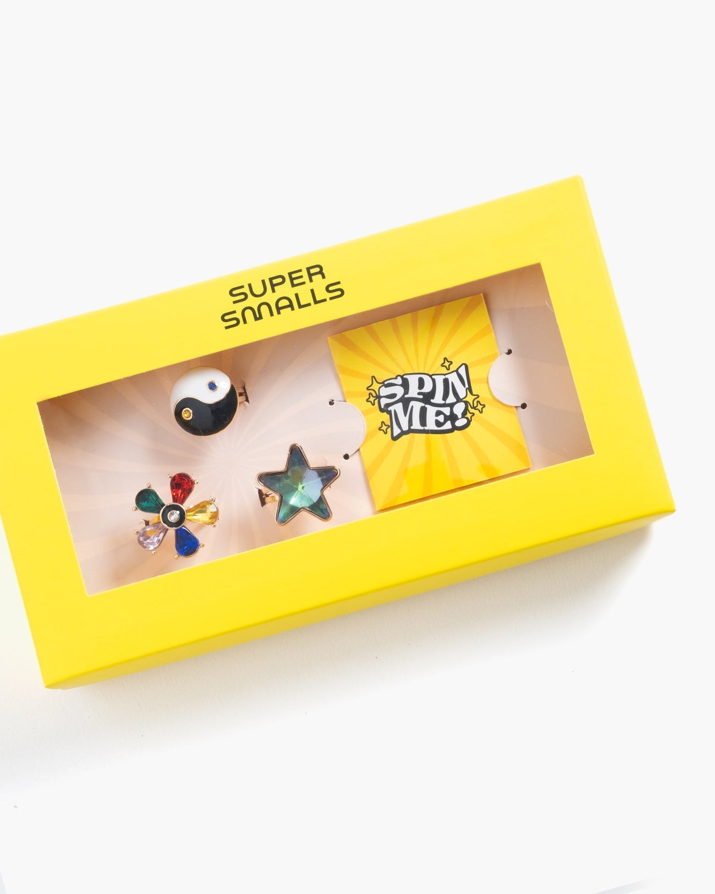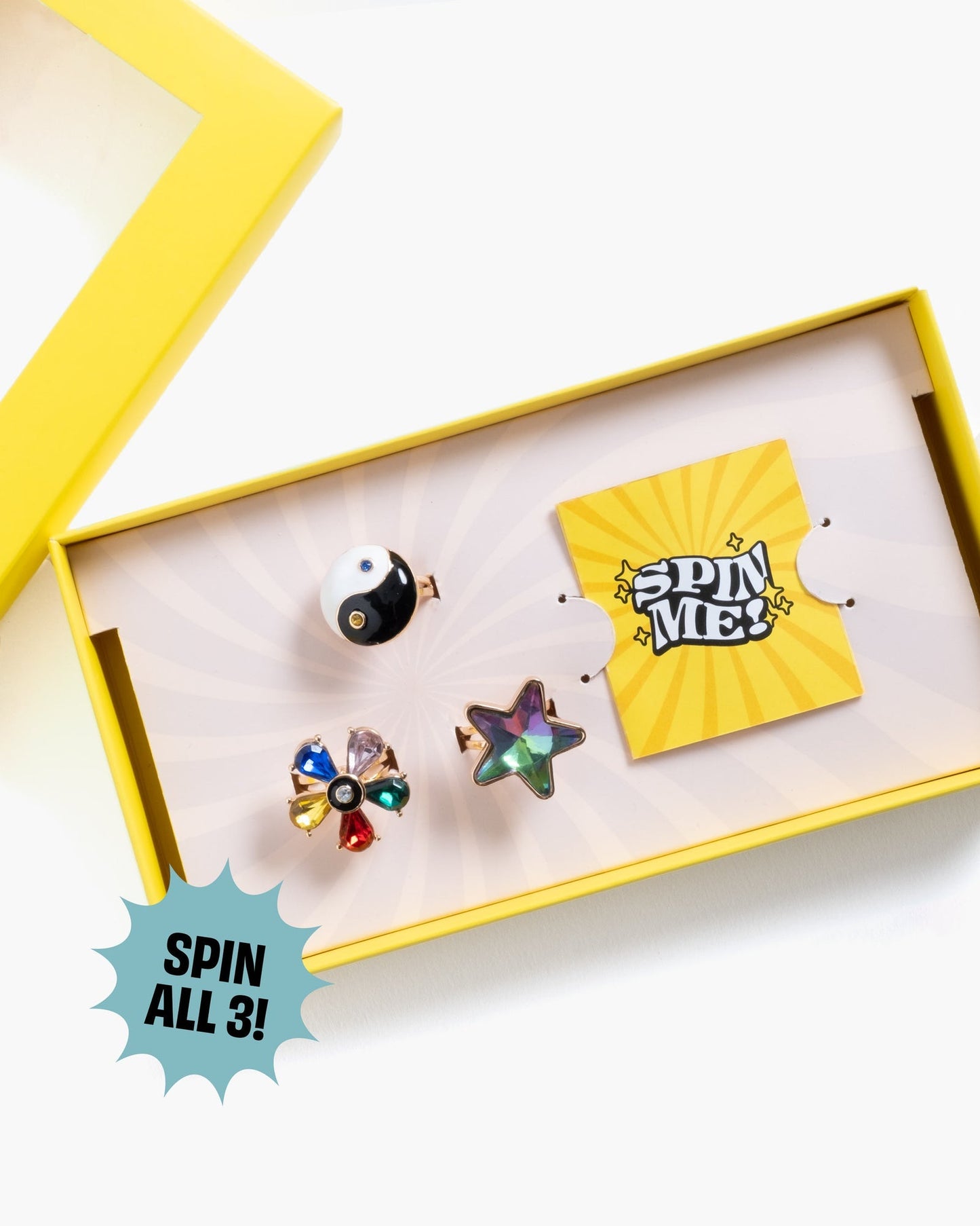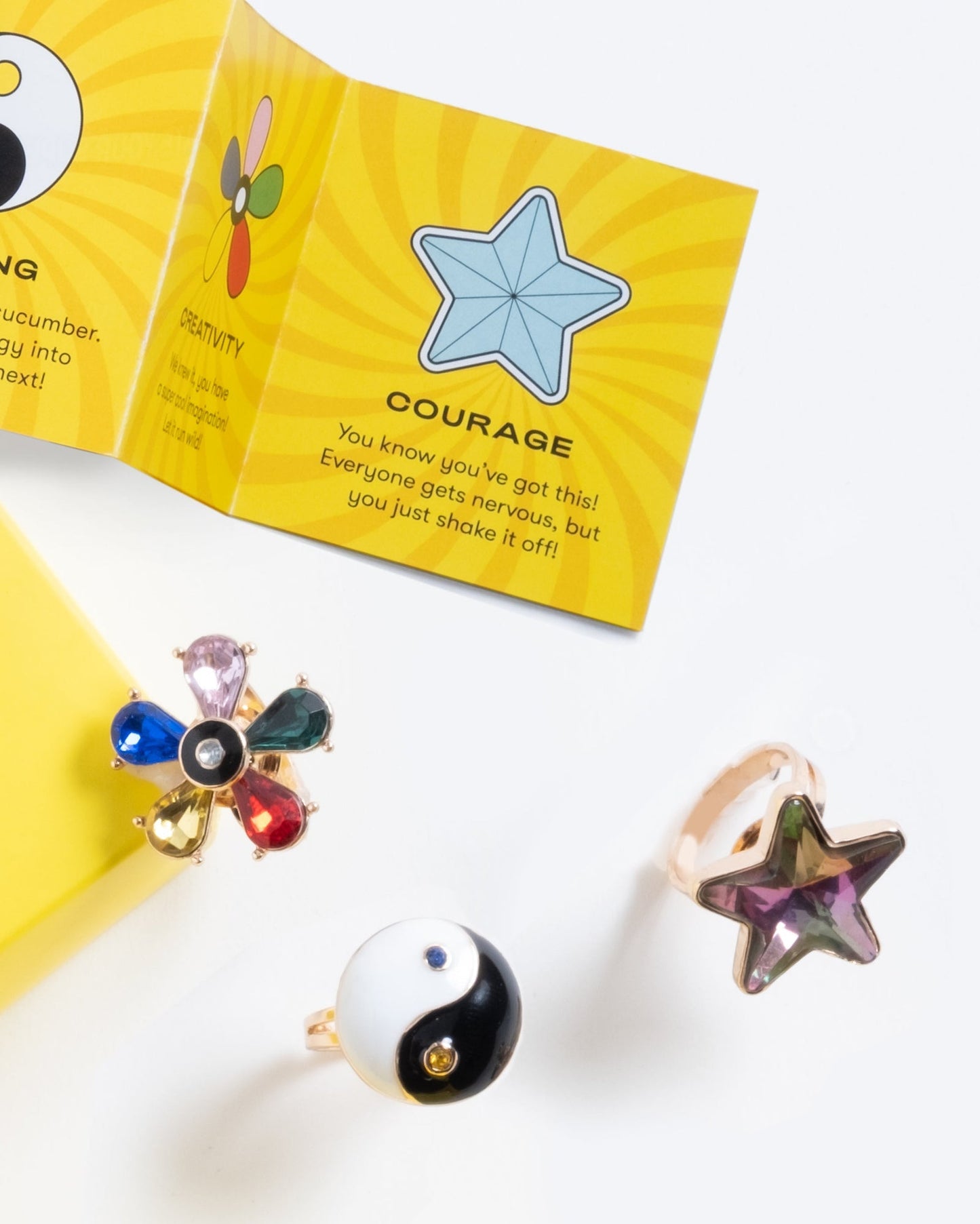 A new (and SUPER cool) take on the fidget spinner, our Spinner Rings double as fashion-forward jewels and a tool to help you focus! The set includes three adjustable rings—an iridescent star, a powerful yin-yang, and a colorful gem flower. Plus, a booklet explains how to use the rings to release your inner superpowers—spin, spin, spin to unlock courage, calm, and creativity… all while showing off your personal style!