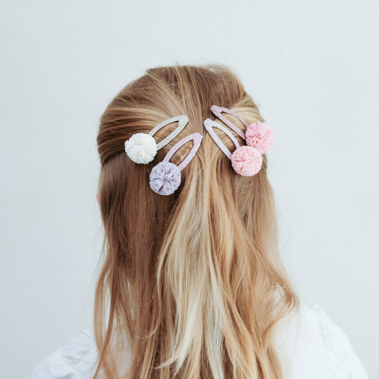 Soft and delicate tulle pom poms sure to delight your little ones! Perfectly pretty and practical too, sure to stay put in even the finest hair. Pom pom perfection!