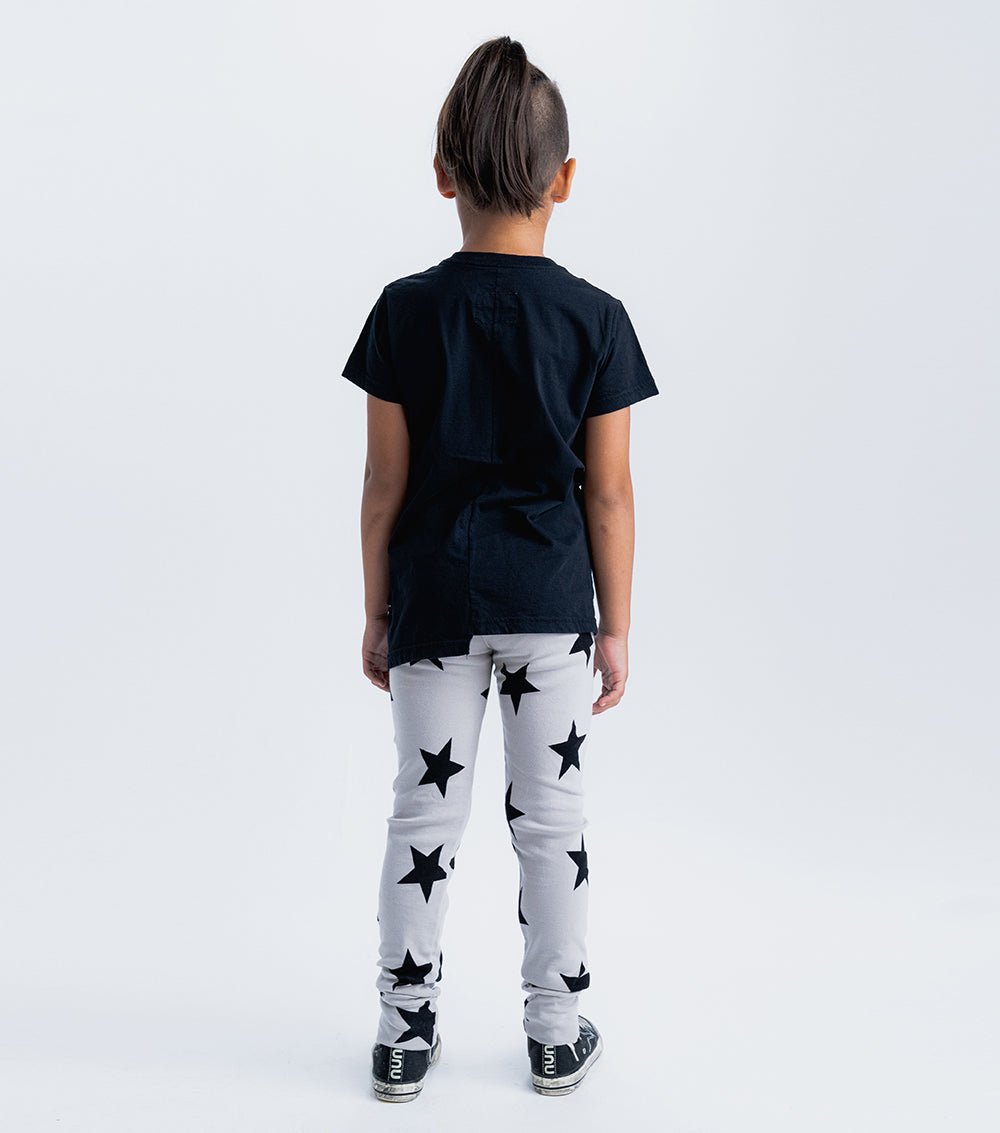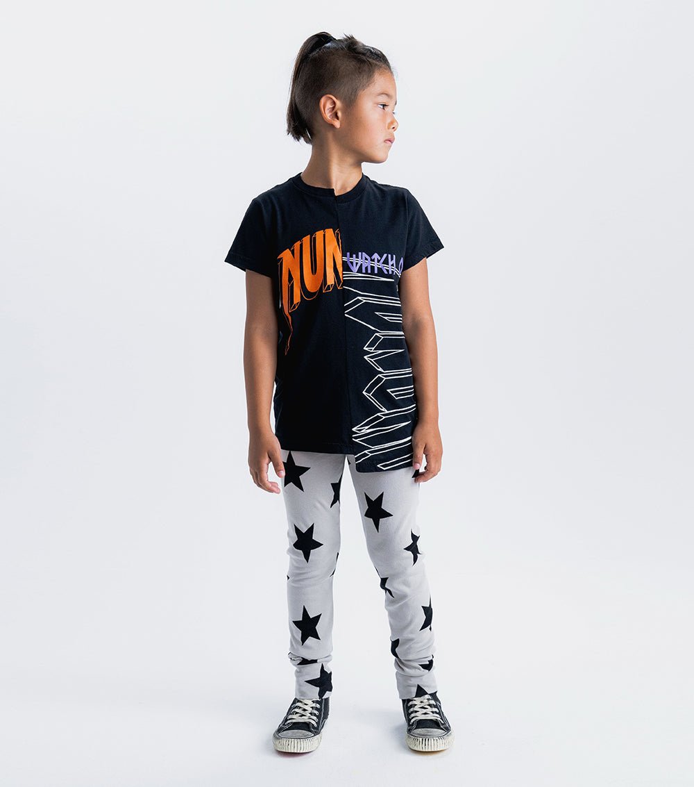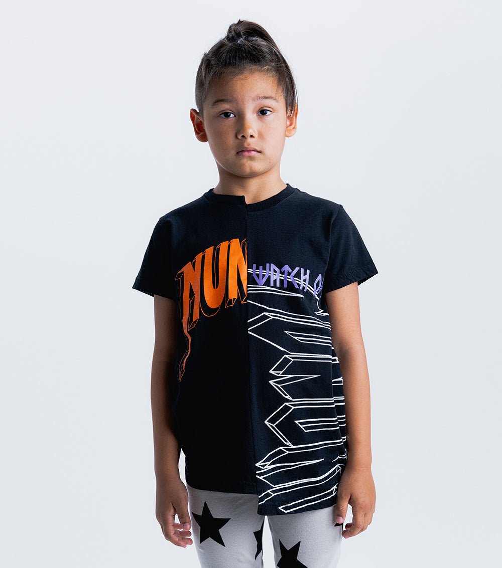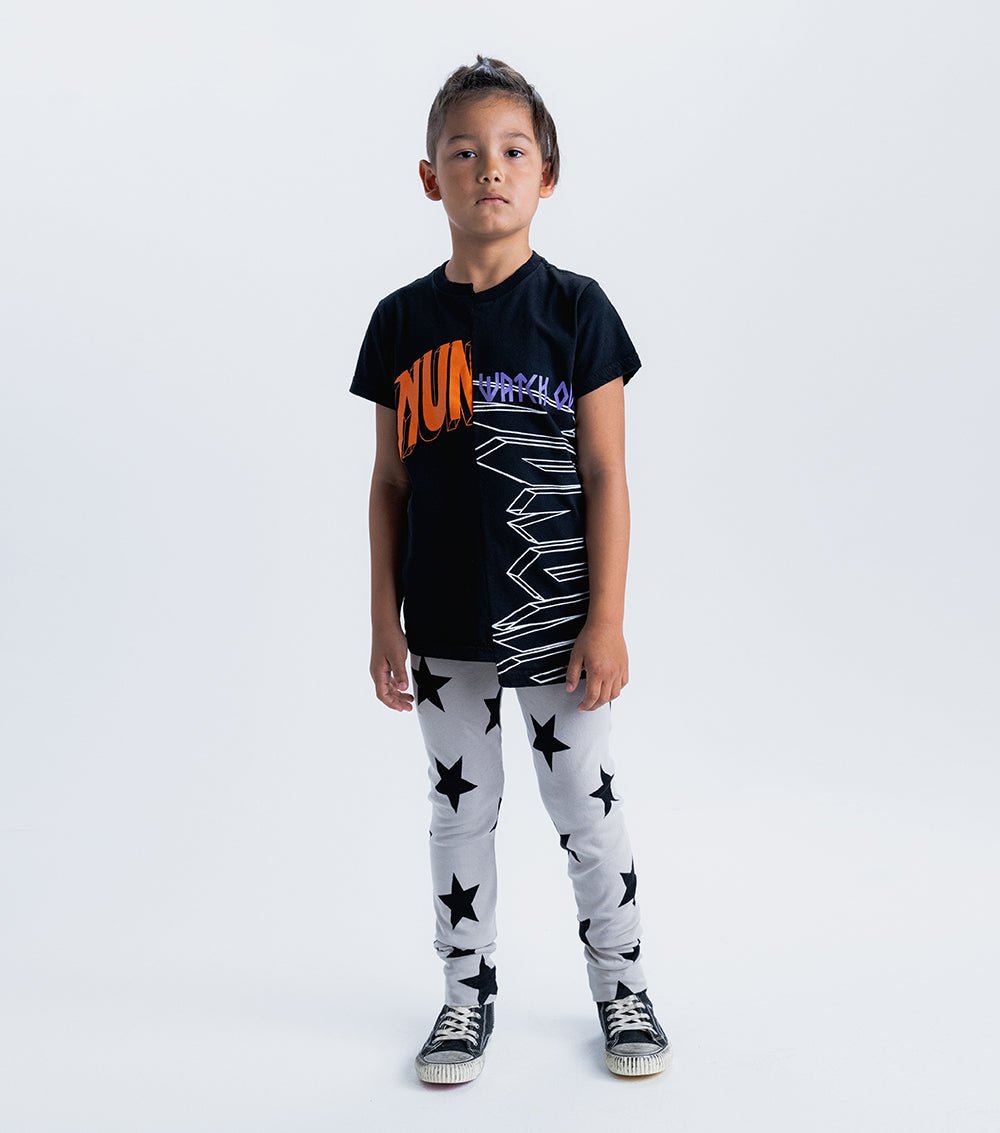 this black t is out of this world, literally. it's a heavy single cotton fit for boys & girls with our new earth print surrounded by a totally rockin take on our nununu logo and some seriously rad lightning bolts to show which kid has all the power. it also says down to earth in our angular print because the world should know this kid totally is. peep the star underneath because that's our thing. to edge it up we’ve added a custom paint splattered look on it along with raw hemlines on the sleeves and on the back hem too. in the front, the hem is totally regular except for our signature touch of custom deconstruction. you know you love it.