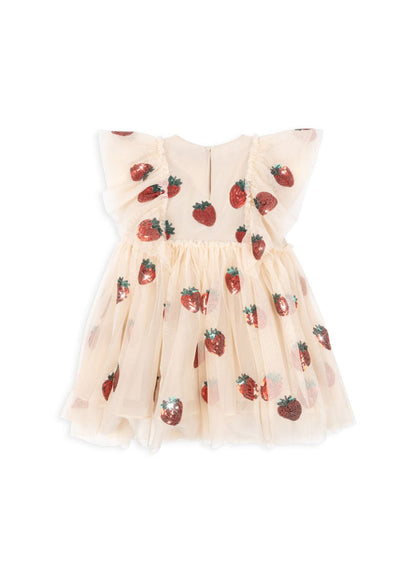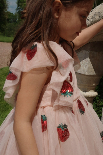 This voluminous tulle dress is adorned with delicate sequin strawberry embroidery and finished with soft frills for a dreamy silhouette.